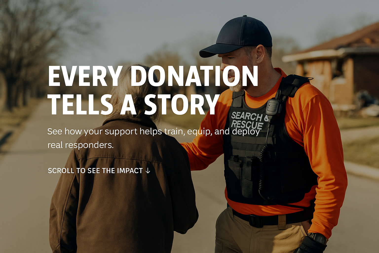 Donations cover the cost of getting responders where they’re needed — fuel, meals, insurance, lodging, and communications gear. Without this, gear and training mean nothing. You make boots-on-the-ground possible.